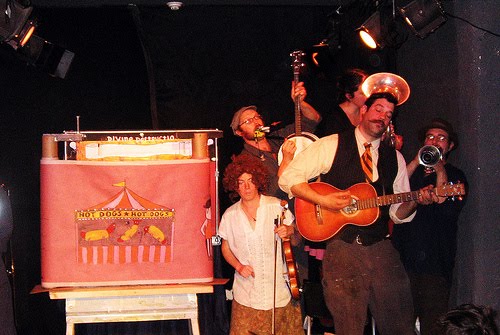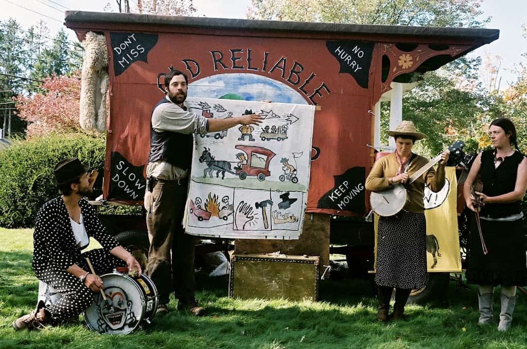 Above is pictured the “Where Are We Going” Cantastoria from the Old Reliable Horsedrawn Spectacular and a cranky from the Boxcutter Cabaret being performed in Philadelphia. Below is a picture of Lindsay performing her robot cantastoria as the Professor D. Wabbit.