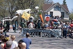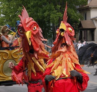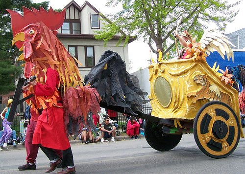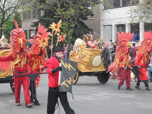 Pictures of Mayday 2010: This Mayday Parade turned out to be a lot of fun. We managed to find some pictures here and there. Featured here are six dedicated puppeteers dressed as roosters pulling two golden chariots with winged archers atop accompanied by a flower clad band of horns drums and “thunder sheets.” It was memorable.