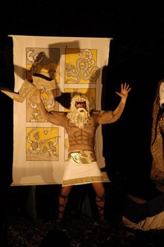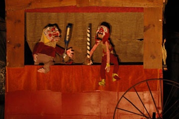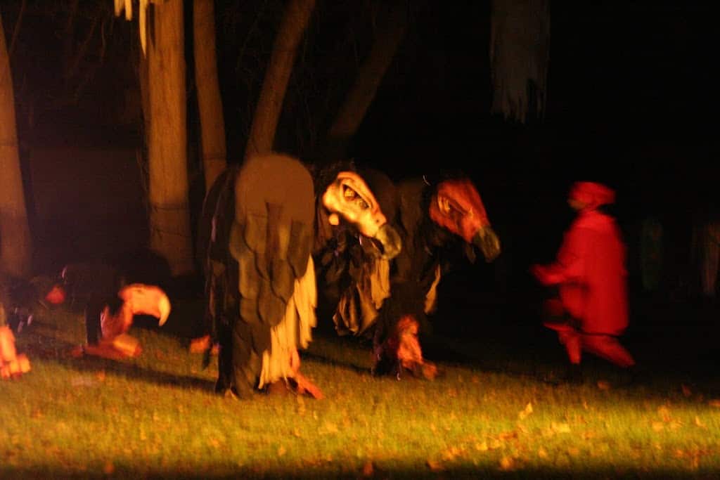 Lindsay and Federica Collina menacing little red riding hood in the 2009 Barebones Halloween Show as giant vultures.