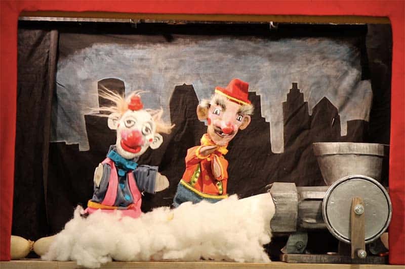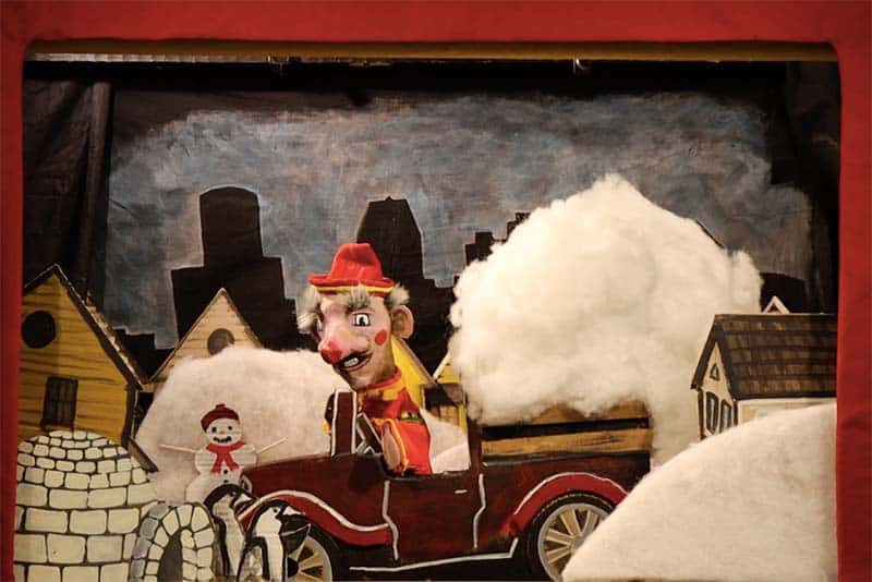 “There’s Snow Business Like Snow Business” is a puppet comedy featuring the world-famous “Mr. Punch” in a madcap wintertime adventure. Mr. Punch, dismayed by the lack of snowy winters in Detroit, miraculously invents a fun form of fake snow using his family heirloom meat grinder. Mayhem ensues. Towards the end of the show the audience steps in to save Mr. Punch from his own bad choices. For ages 5-105. 25 minute show with live music.